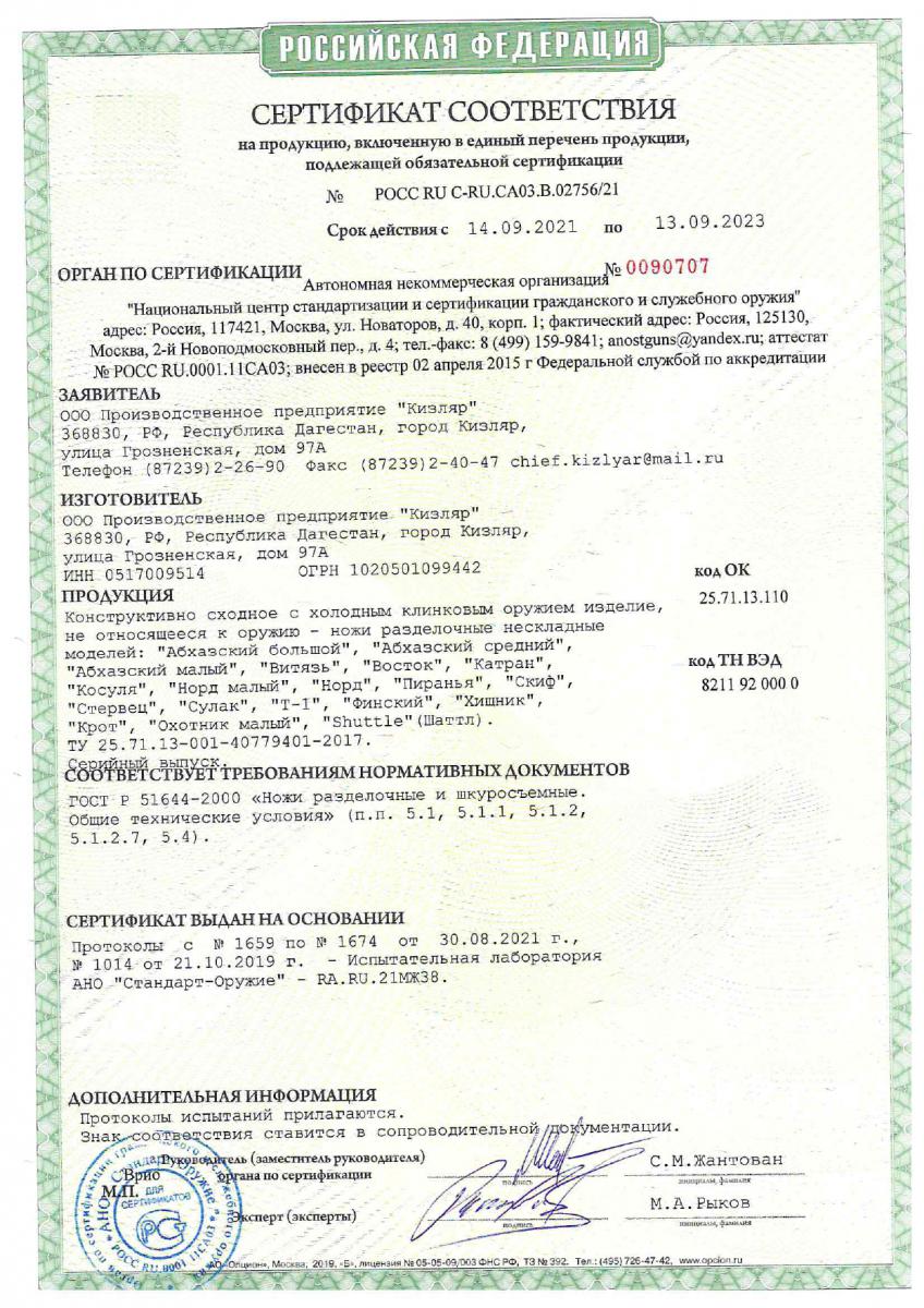 Нож Кизляр "Крот" 014205 артикул 03064 купить в Санкт-Петербурге по цене 0 рублей в интернет-магазине Steel-Gun. Получите заказ самовывозом в Санкт-Петербурге бесплатно или закажите доставку в любой регион России транспортными компаниями СДЭК, Яндекс.Доставка или Почтой России. Оплатите онлайн или при получении (при доставке до 7 дней). Подробнее об оплате и доставке. Лицензия на приобретение не требуется. Перед оформлением заказа обязательно уточняйте комплектацию товара по телефону 8 (904) 215-66-30 (в рабочее время) или по e-mail и системе обратной связи (в любое удобное для вас время). Информация от товаре Нож Кизляр "Крот" 014205 артикул 03064 носит ознакомительный характер, характеристики, внешний вид, цвет и комплектация могут быть изменены производителем без уведомления.