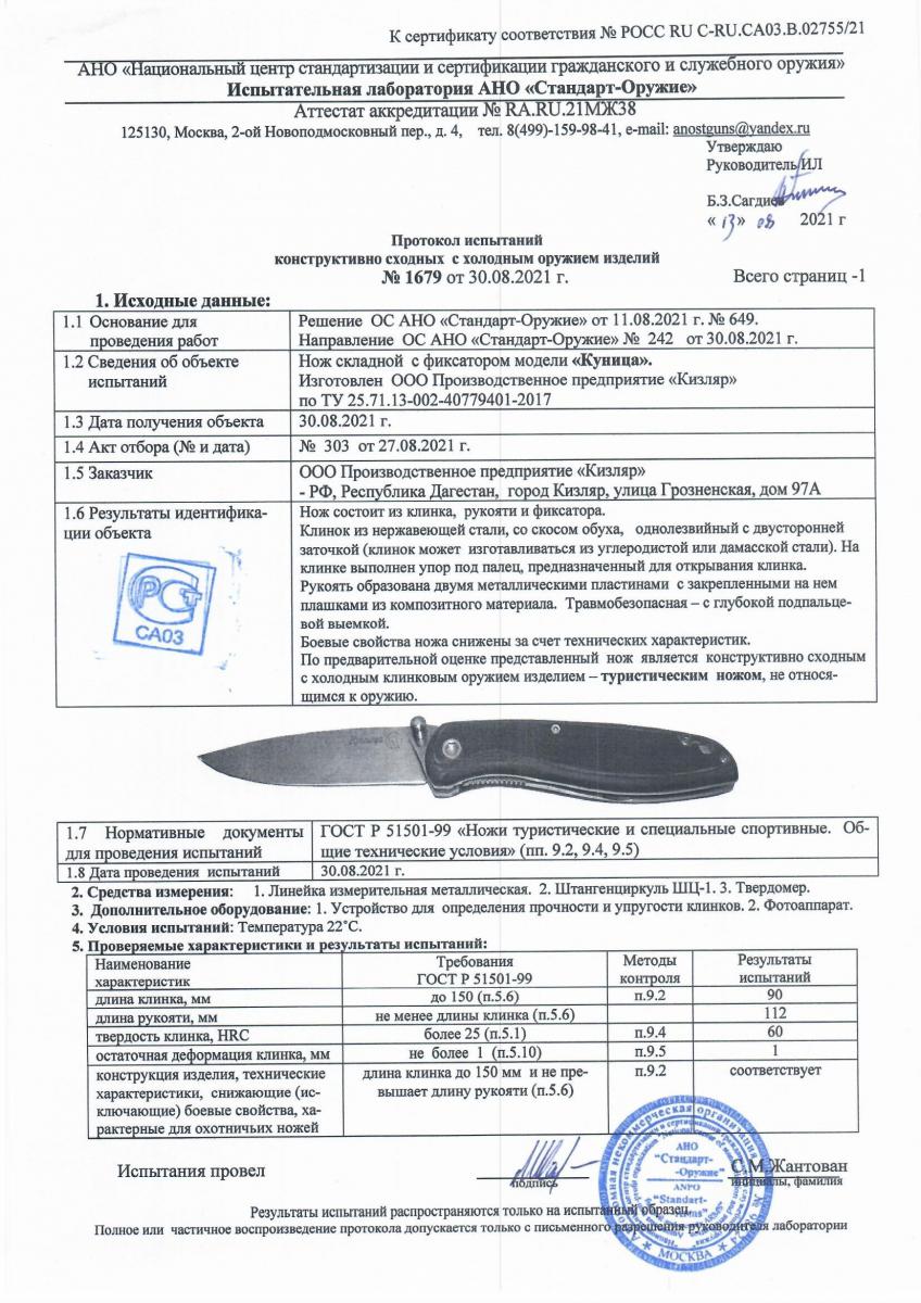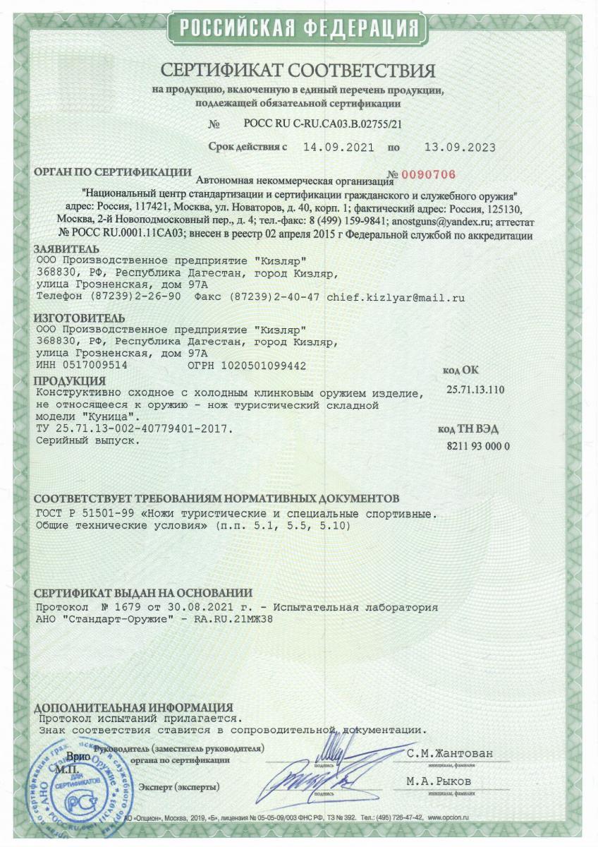 Нож Кизляр "Куница" 011100 артикул 08016 купить в Санкт-Петербурге по цене 0 рублей в интернет-магазине Steel-Gun. Получите заказ самовывозом в Санкт-Петербурге бесплатно или закажите доставку в любой регион России транспортными компаниями СДЭК, Яндекс.Доставка или Почтой России. Оплатите онлайн или при получении (при доставке до 7 дней). Подробнее об оплате и доставке. Лицензия на приобретение не требуется. Перед оформлением заказа обязательно уточняйте комплектацию товара по телефону 8 (904) 215-66-30 (в рабочее время) или по e-mail и системе обратной связи (в любое удобное для вас время). Информация от товаре Нож Кизляр "Куница" 011100 артикул 08016 носит ознакомительный характер, характеристики, внешний вид, цвет и комплектация могут быть изменены производителем без уведомления.