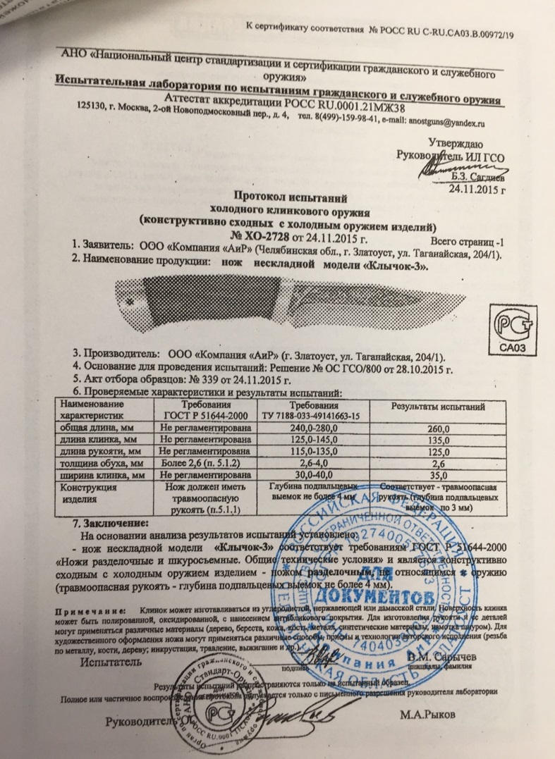 Клинок выполнен из высоколегированной нержавеющей стали 95Х18. Изделия из нее обладают высокой твердостью, кромка клинка устойчива к сколам и долго сохраняет остроту. Вогнутые линзовидные спуски от середины клинка образуют тонкое, прекрасно режущее лезвие. Дополнительную прочность ножу придает сквозной неразборный монтаж, а также алюминиевые гарда и тыльник.