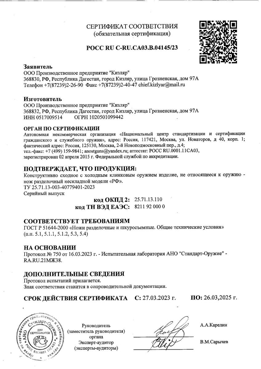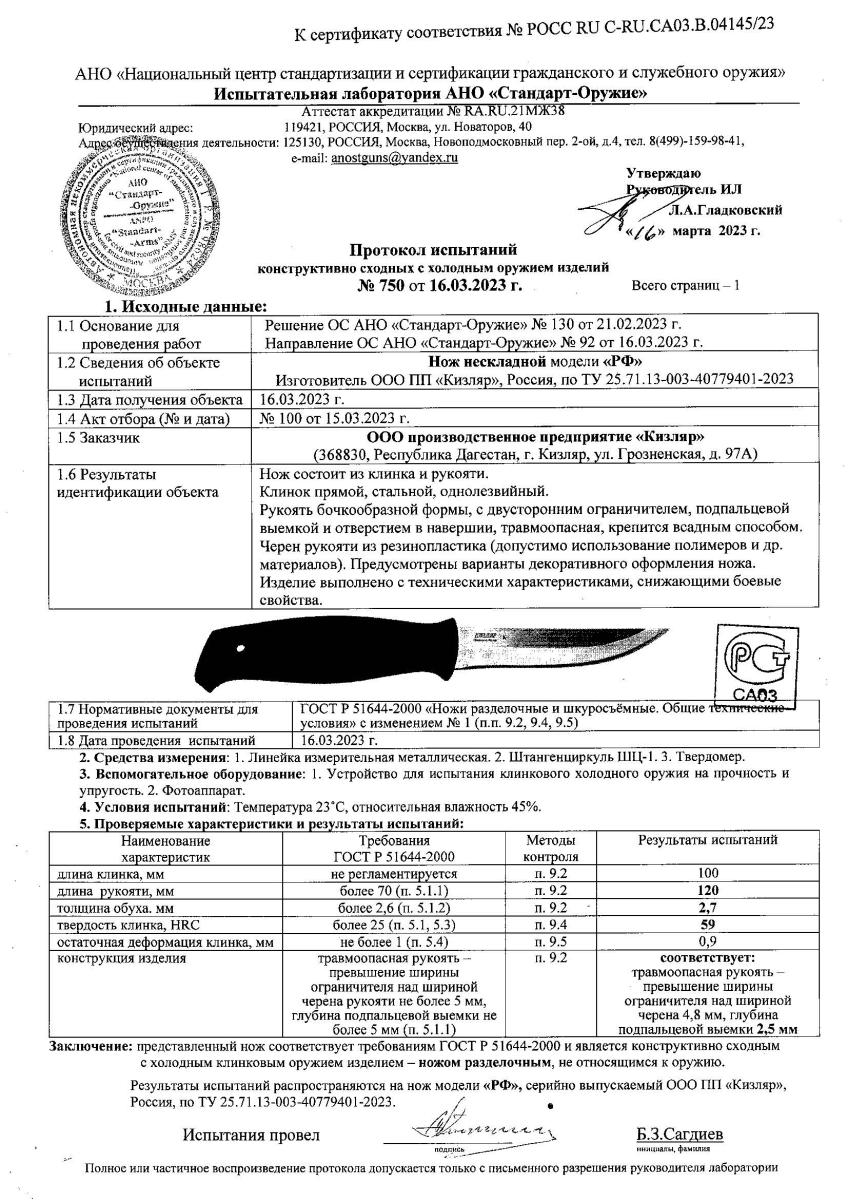 Нож "РФ" 015307 артикул 03282 купить в Санкт-Петербурге по цене 1 640 рублей в интернет-магазине Steel-Gun. Получите заказ самовывозом в Санкт-Петербурге бесплатно или закажите доставку в любой регион России транспортными компаниями СДЭК, Яндекс.Доставка или Почтой России. Оплатите онлайн или при получении (при доставке до 7 дней). Подробнее об оплате и доставке. Лицензия на приобретение не требуется. Перед оформлением заказа обязательно уточняйте комплектацию товара по телефону 8 (904) 215-66-30 (в рабочее время) или по e-mail и системе обратной связи (в любое удобное для вас время). Информация от товаре Нож "РФ" 015307 артикул 03282 носит ознакомительный характер, характеристики, внешний вид, цвет и комплектация могут быть изменены производителем без уведомления.