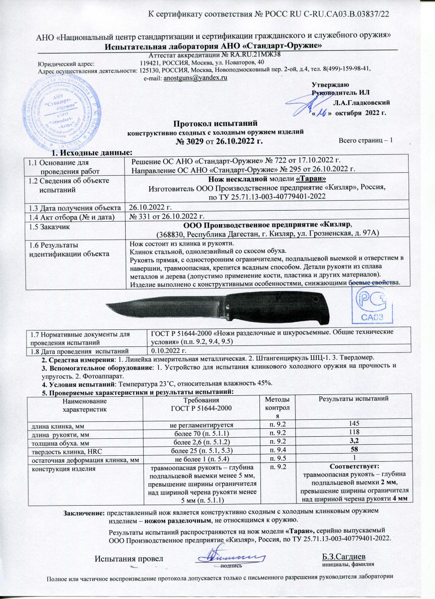 Нож Кизляр "Таран" 011161 артикул 03150
