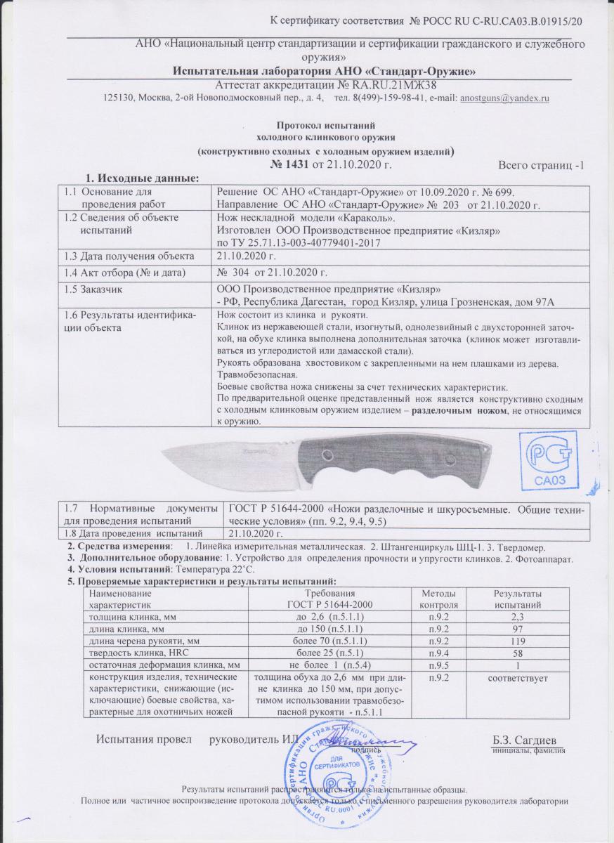 Нож Кизляр "Караколь" 015101 артикул 03048
