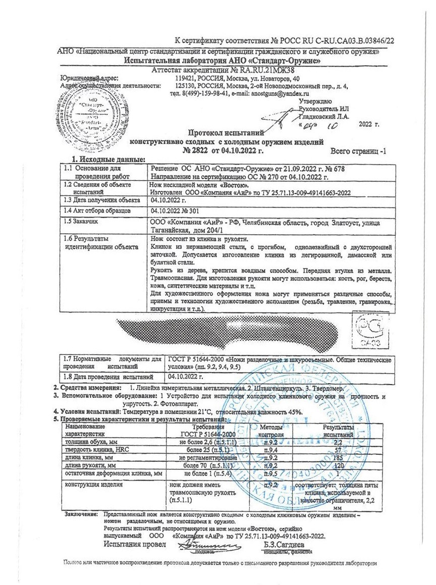 Нож Восток выполнен в стиле классического ятагана. Его небольшой по длине клинок обладает линзовидными вогнутыми спусками, а обух имеет достаточно широкую голомень. Такая геометрия клинка обеспечивает ножу не только прекрасные режущие характеристики, но и дополнительную прочность. Такой нож является хорошим вариантом выбора аксессуара для работ на природе.