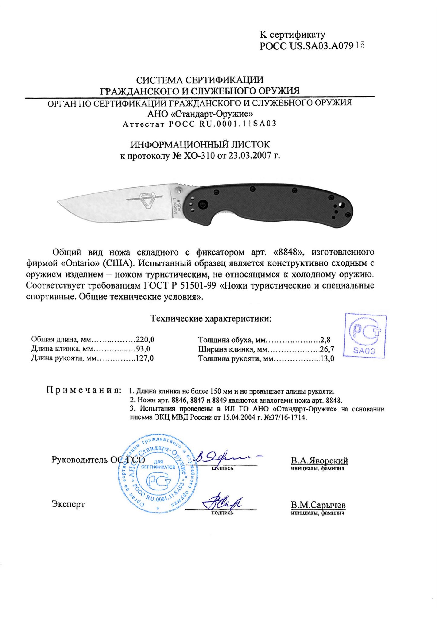 Ontario RAT-1 — модель из серии RAT, американской компании Ontario Knife Company. Эти ножи разрабатывались специалистами по выживанию в экстремальных условиях и рассчитаны на эксплуатацию в таких же ситуациях. Клинок выполнен из AUS-8 — это сталь японского производства, которая за относительно низкую цену дает оптимальное сочетание гибкости и твердости, неплохой рез, а также хорошую антикоррозионную стойкость. Рукоять модели выполнена из термопластика GRN — живучего материала, который хорошо противостоит ударам и открытому огню. К его минусам можно отнести слабую переносимость холодов — при температуре ниже 17 градусов ударная прочность может снизиться, однако, если говорить об остальных характеристиках данного материала, он сполна оправдывает свою стоимость.